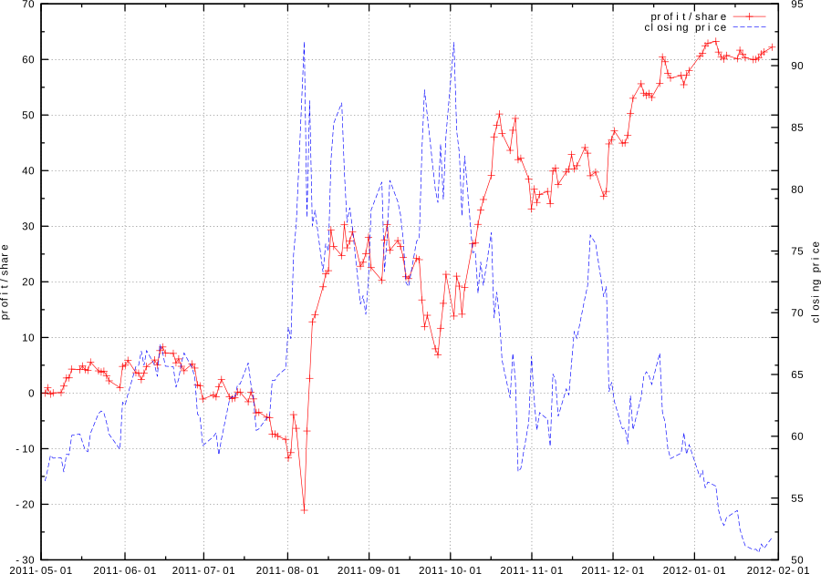 Below are plots of BOP profit per share (red) along with the closing price (blue) for the top 3 ETFs. Note that the first 2 plots are nearly identical because SKF and FAZ are very similar ETFs.
